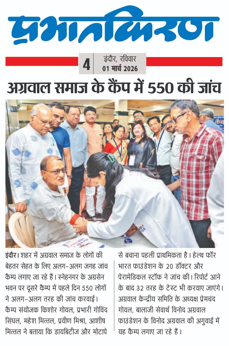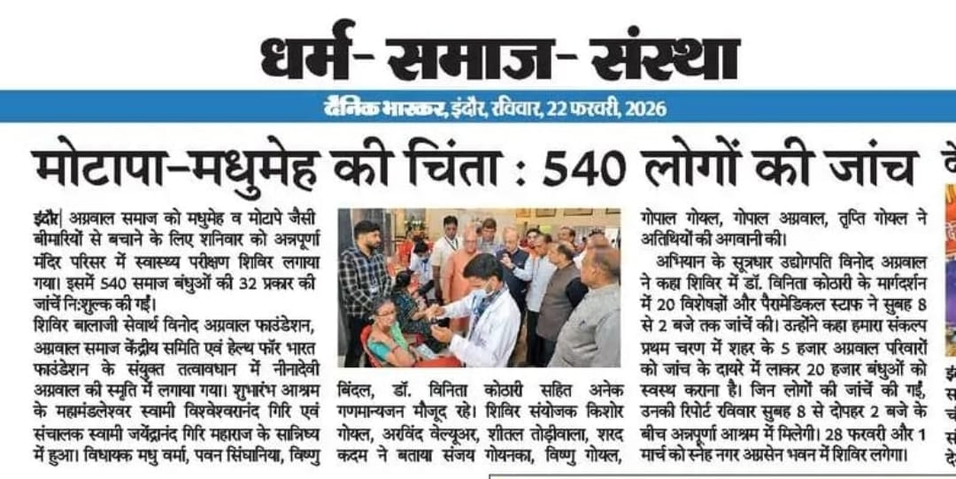 A series of Free Health Check-up Camps was initiated on 21st February 2026 in the sacred memory of Shrimati Neena Devi Agarwal. This noble initiative is a joint effort by Agarwal Kendriya Samiti , Balaji Sewarth Vinod Agarwal Foundation, and Bharat Foundation. The first camp was organized at Annapurna Ved Bhavan Mandir. During this two-day free health check-up camp, more than 1000 people benefited and utilized the medical facilities provided by the team of doctors and healthcare professionals. The primary objective of this initiative is to spread health awareness and help society move towards freedom from diabetes and obesity. In continuation of this mission, similar health camps will be organized at various locations across Indore and nearby areas, and this campaign will continue as a larger movement for public health. The camp was conducted under the guidance and presence of Mahamandaleshwar Swami Vishweshwaranand Giri Ji Maharaj, whose blessings marked the auspicious beginning of this noble service. Specialist doctors and experienced paramedical staff provided medical consultations, health check-ups, and expert advice and other medical experts offered valuable guidance to patients during the camp. This initiative reflects a strong commitment towards community welfare, preventive healthcare, and social service.