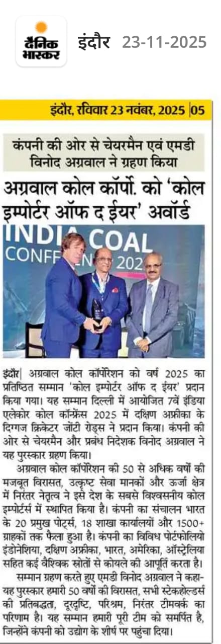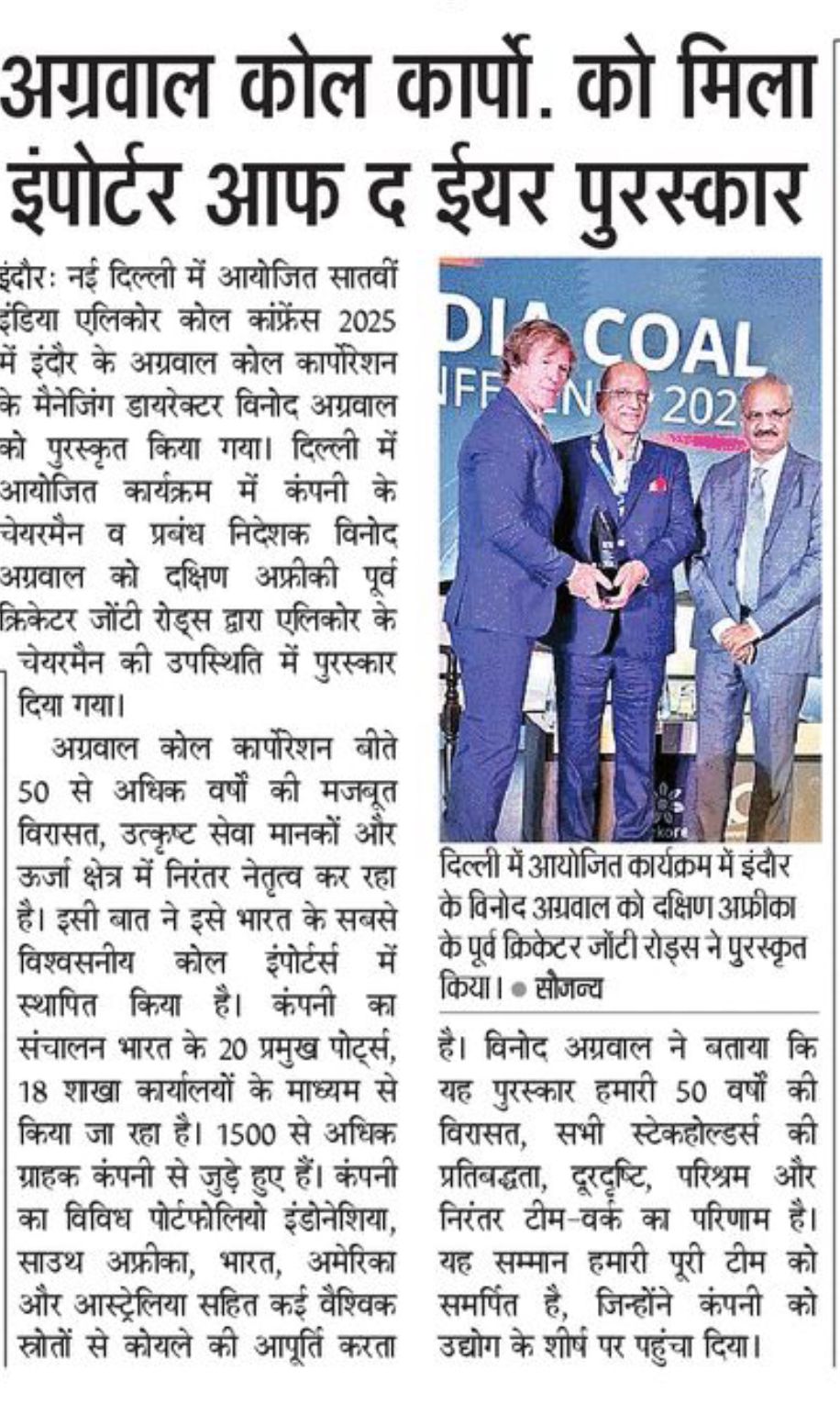 Agarwal Coal Corporation was conferred with the prestigious Coal Importer of the Year – 2025 award at the 7th India Africa Global Coal Conference, held in New Delhi. The award was received by Shri Vinod Agarwal, Chairman & Managing Director of Agarwal Coal Corporation, recognising the company’s outstanding contribution to India’s coal import sector.