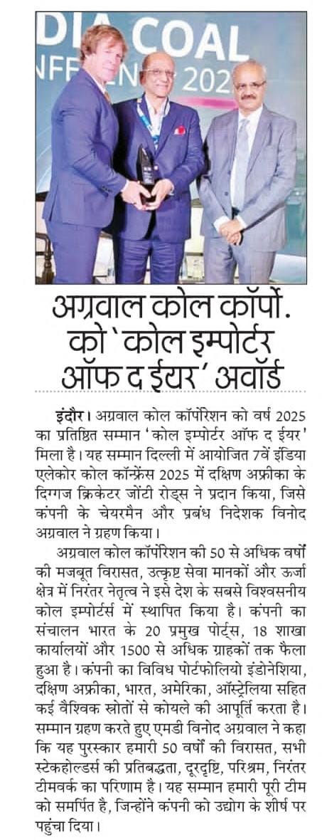 Speaking on the occasion, Shri Vinod Agarwal dedicated the honour to the company’s team and stakeholders, highlighting that the recognition reflects decades of commitment, teamwork, and leadership. The award was presented in the presence of senior industry leaders, further reaffirming Agarwal Coal Corporation’s position as a key contributor to India’s energy and infrastructure growth.