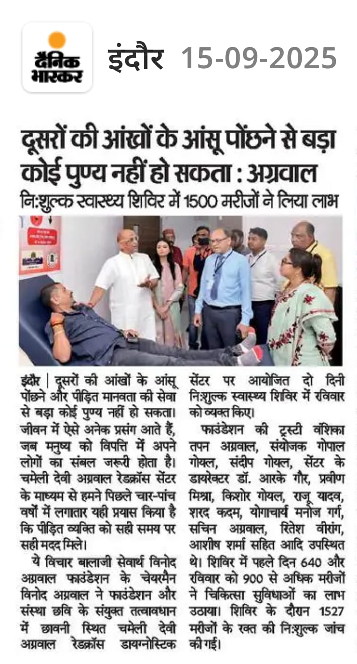 We are pleased to share that a two-day free health camp was successfully organized at the Chameli Devi Agarwal Redcross Blood Bank & Diagnostic Centre on 13th and 14th September 2025.The camp witnessed an overwhelming response, with more than 2,500 beneficiaries availing free health check-ups, diagnostic services, and consultations from expert doctors. Specialized services were extended to people from underprivileged and marginalized communities, ensuring that quality healthcare reached those who need it most.This initiative reflects our continued commitment to accessible healthcare for all and strengthening community well-being through preventive and curative medical support.