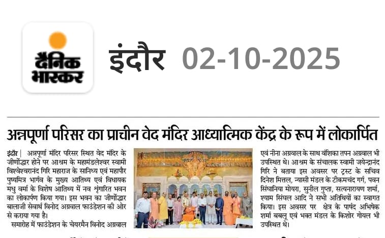 The renovated Ved Temple located within the Annapurna Temple complex, Indore, was inaugurated as a dedicated spiritual centre with the grace of Swami Vishveshwaranand Giri Maharaj and in the presence of Hon’ble Mayor Shri Bhagav Ji, with MLA Shri Madhu Verma as the special guest. The restoration and renovation work was undertaken by Balaji Sewarth Vinod Agarwal Foundation. The newly developed space will serve as a hub for yoga, spiritual practices, and cultural activities, contributing to spiritual awareness and community well-being in the region.